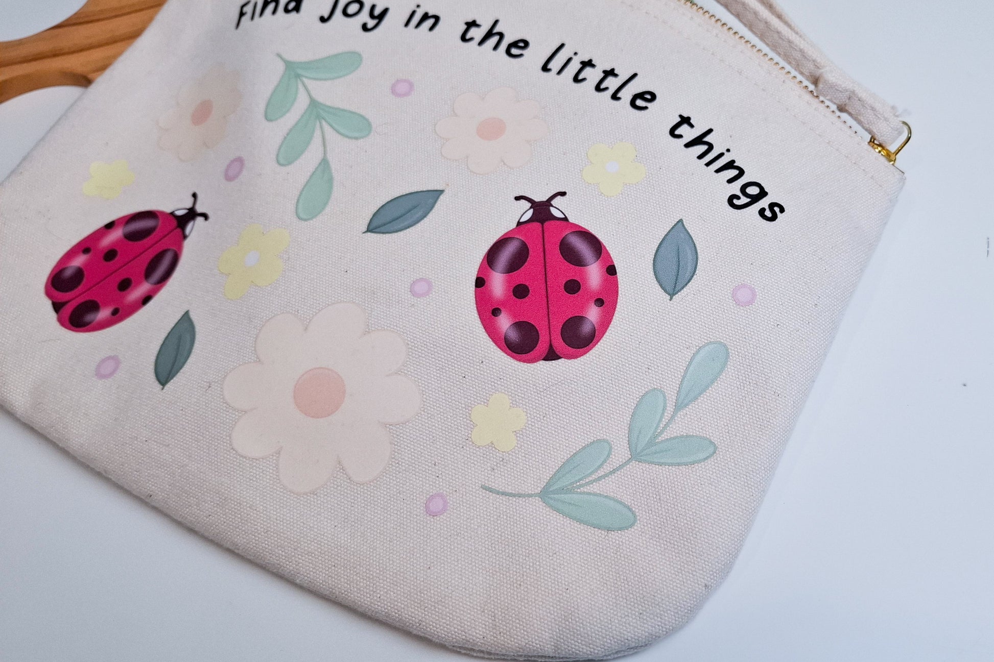 Featuring a gorgeous ladybug floral pattern and the quote 'find joy in the little things'