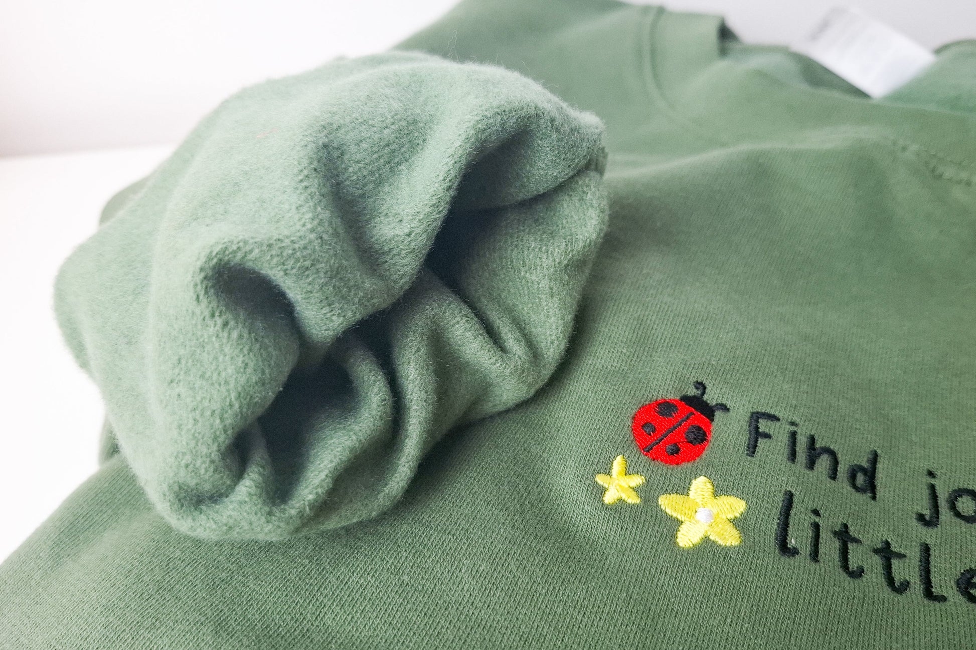 Features the quote 'Find joy in the little things' with pretty little ladybugs and flowers!